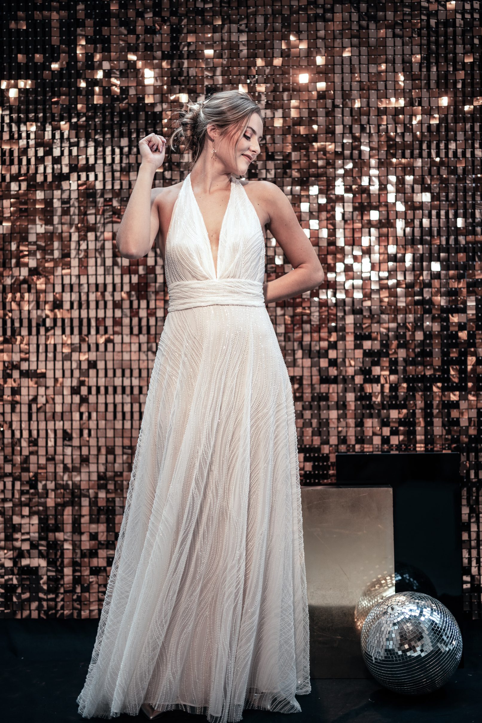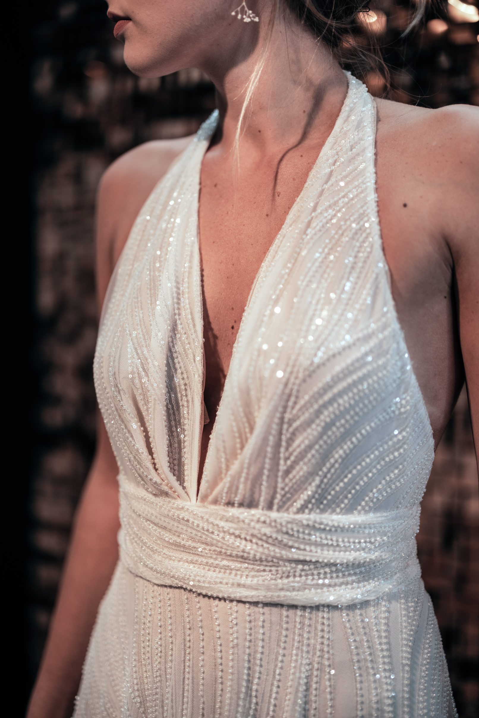 Robe de mariée emmanchures américaines, en tulle brodé de perles de verre en motifs courbes. Ceinture drapée à la taille.