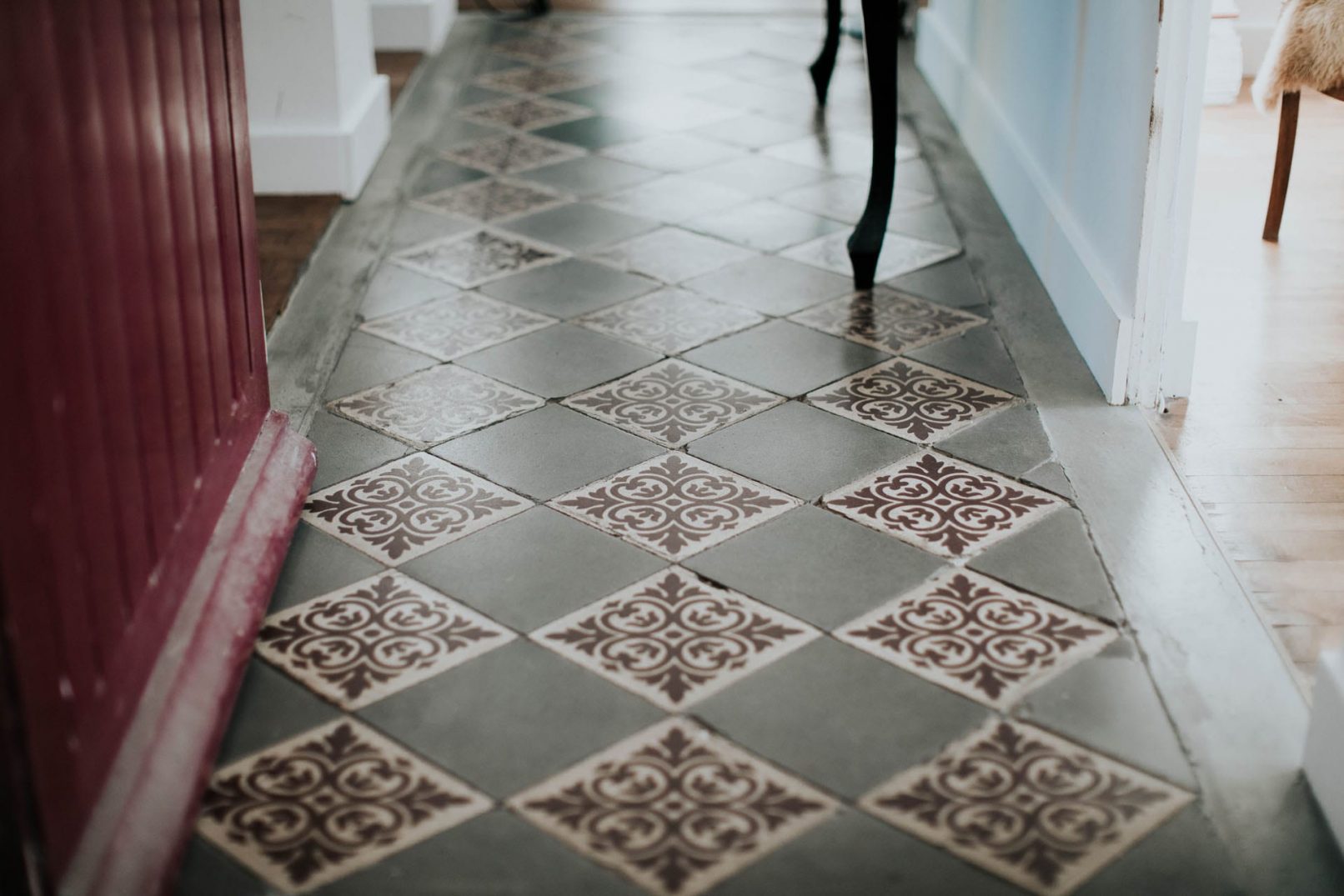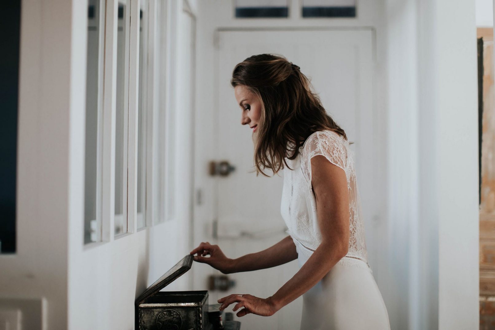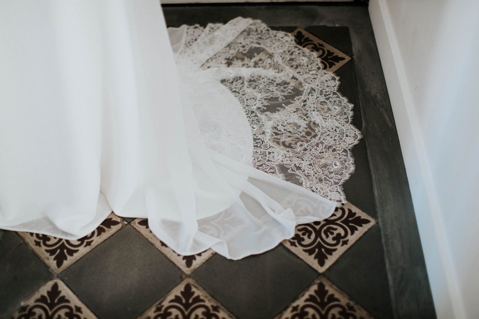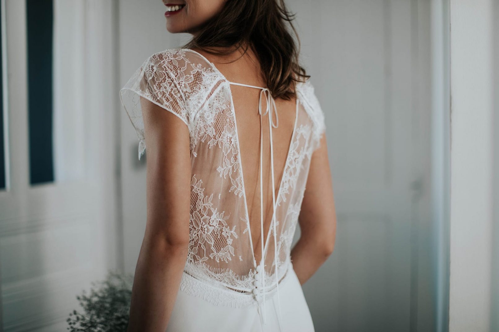 Robe en dentelle de Chantilly Marylène, crêpe lourd de soie et crêpe Georgette de soie.
