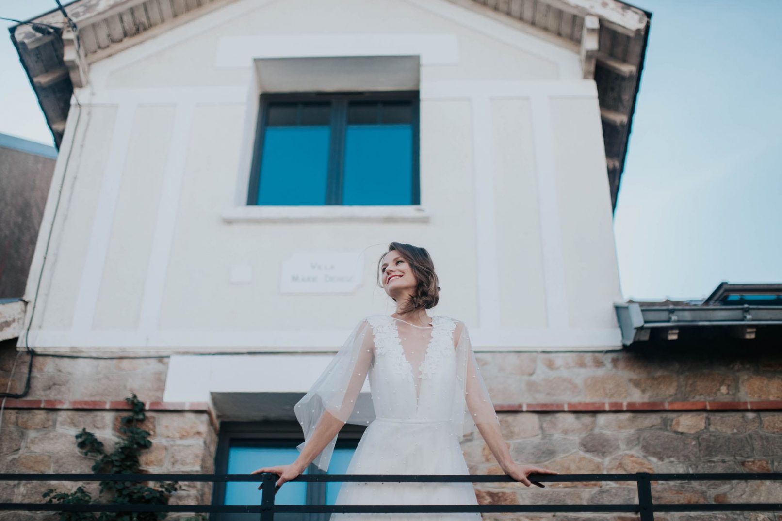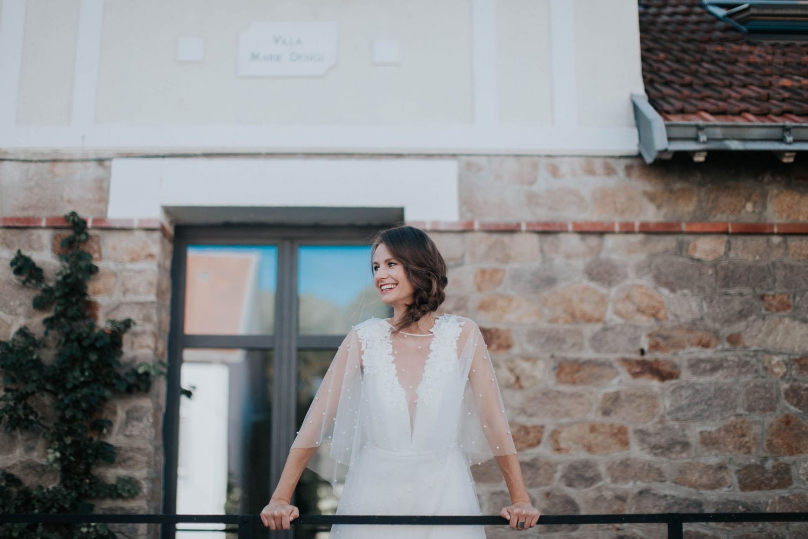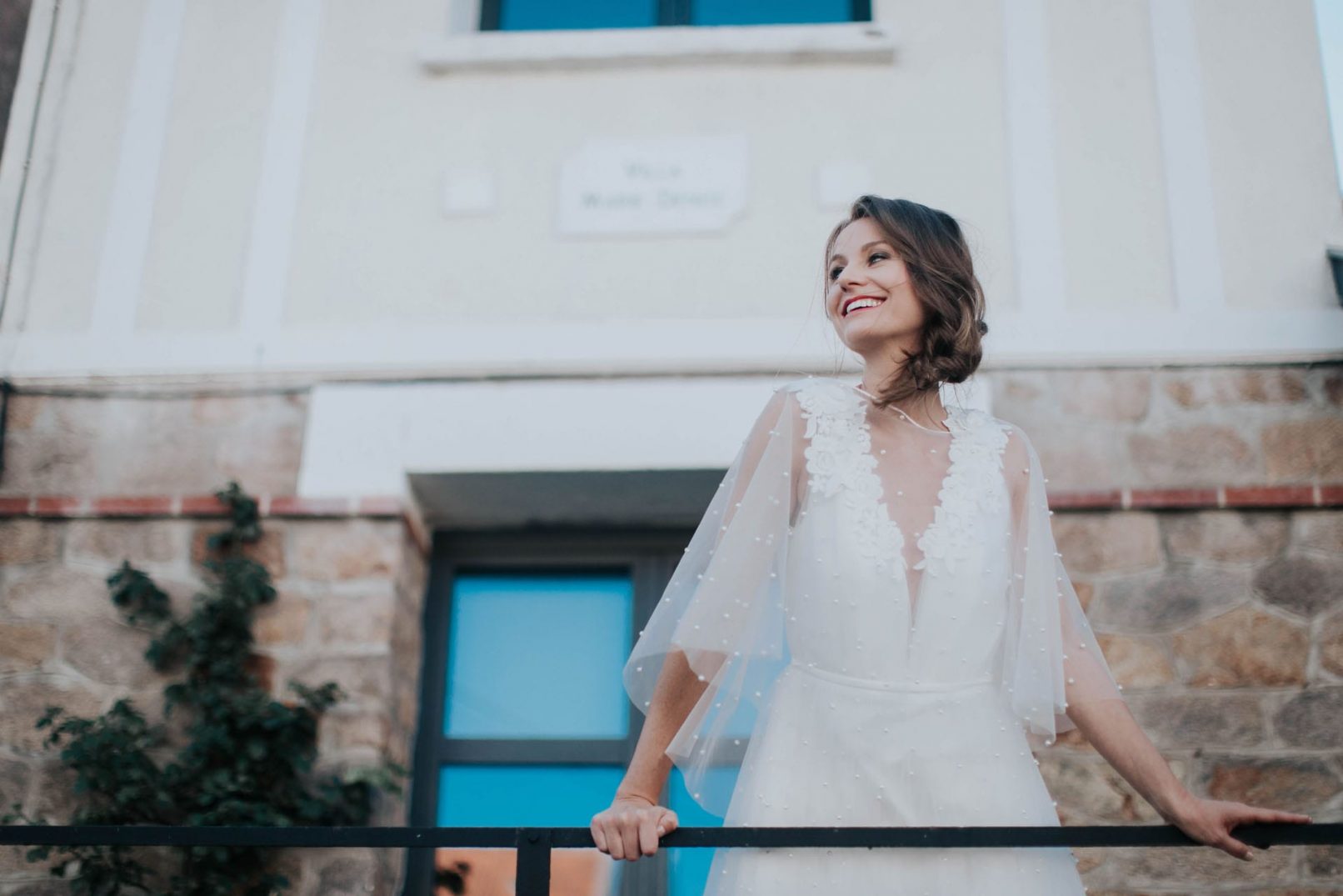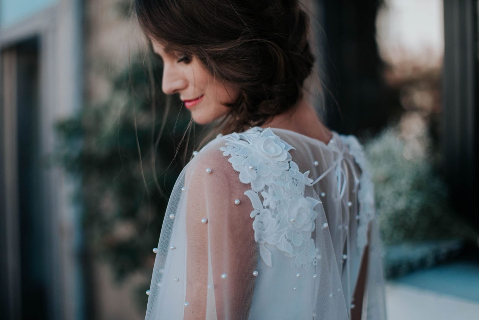 Robe en tulle Babeth perlé et bouquet de fleurs sur épaules.
